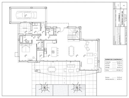 Spread over two floors, this modern villa offers every comfort. The garage or main entrance gives access to the main floor which consists of a bright living room that connects to the fully equipped kitchen with cooking island. Furthermore, we find a storage room, laundry room, guest toilet, and the master bedroom with ensuite bathroom and built-in wardrobes. Both the living room and the bedroom have direct access to the partly covered sun terrace with swimming pool.