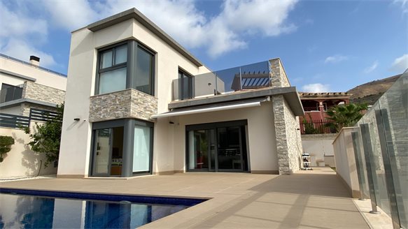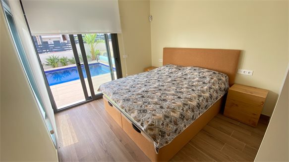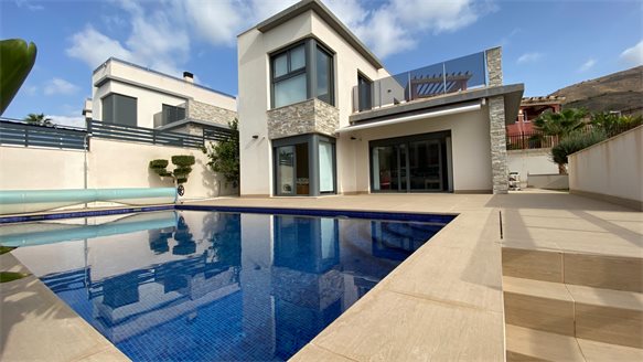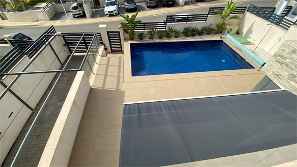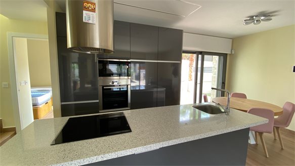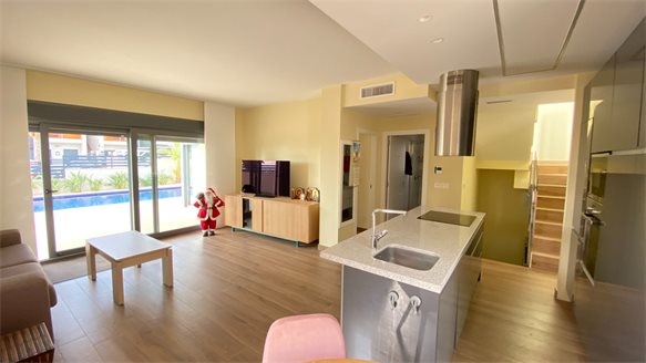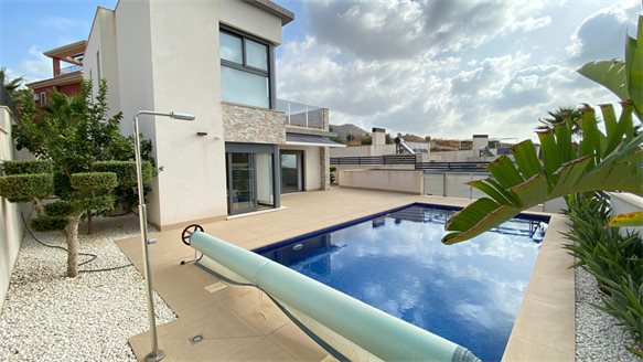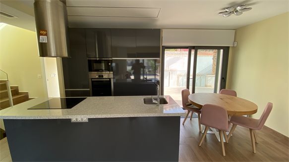 Cozy modern style villa in Balcon de Finestrat 4.5km from the center and the beach of Benidorm, 2.6km from Finestrat. The house has an area of 240m2 distributed over three floors. On the basement floor of 95 m2 there is a very large room with access to a sauna and laundry, a large bedroom and a bathroom. The ground floor is distributed between a large living room with an open kitchen, with access to the covered terrace, 3 large bedrooms, 3 bathrooms. On the upper floor we find the main bedroom with its dressing room and en-suite bathroom and with access to a large terrace, The villa is built and finished with high quality materials. It is equipped with air conditioning and central underfloor heating. Outside we find the pool area, barbecue area and garden.