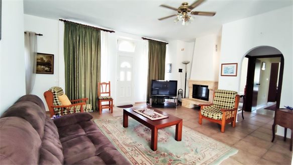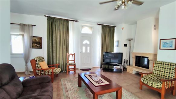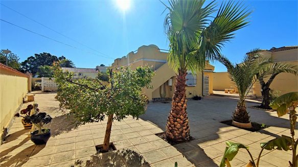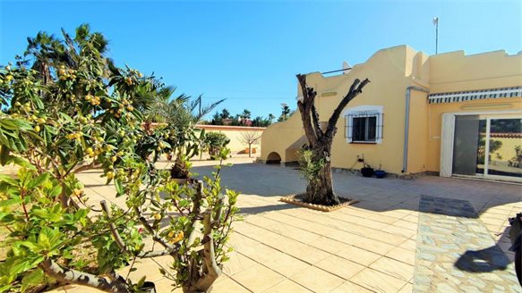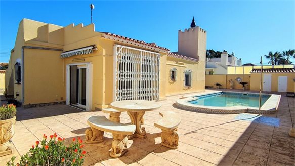 Outstanding Mediterranean style one-level villa with a great location in the area of Torreta Florida, close to the pink lake and Habaneras shopping center in Torrevieja. This beautiful property is built on a large and sunny corner plot of 800 m2 and has over 120 living area + garage and outside storage and bathroom. Distributed over one floor and consists of a large and bright lounge / dining room with firespace, separated fitted kitchen, three double bedrooms with fitted wardrobes and three bathrooms. The master bedroom has en-suite bathroom.