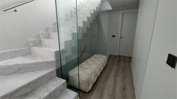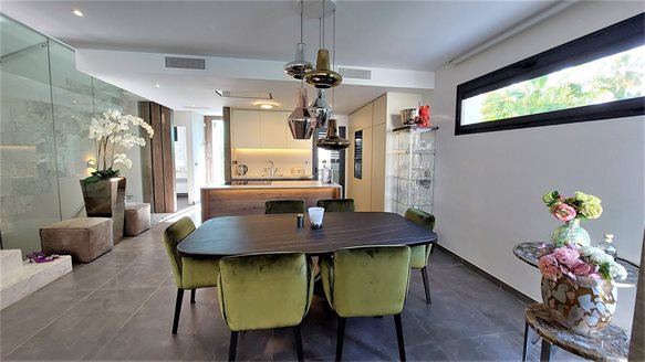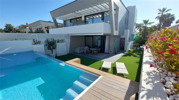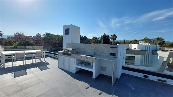 In Puerto Banús, just 300 metres from the Playa del Duque beach which can be reached on foot, we find this magnificent semi-detached villa on 4 floors including basement with garage for 2 cars and solarium with barbecue area and jacuzzi. Its decoration is minimalist, its clean lines and vegetation populates the surroundings of the houses.