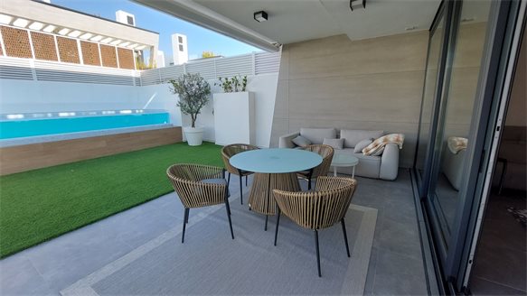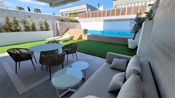 With large floor to ceiling windows throughout the house, the living room windows open up the space to a large covered terrace, the swimming pool and the well-kept private garden. There are 3 spacious bedrooms, the master with dressing room and en suite bathroom. The interiors are elegant and welcoming, reflecting a tranquil and contemporary lifestyle.