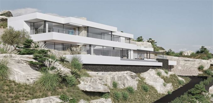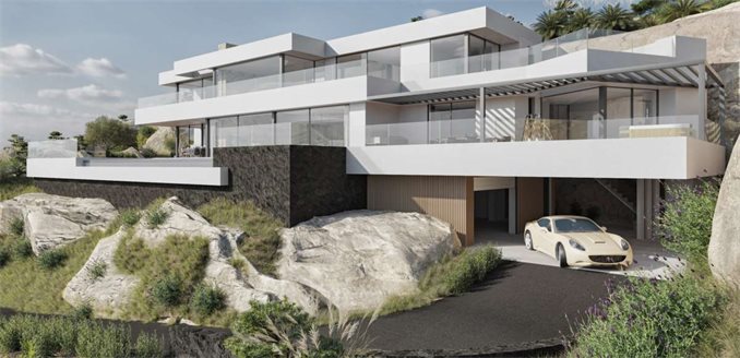The plot of 1395m2 equipped with design garden, automatic irrigation, overflowing heated pool, parking for two cars.