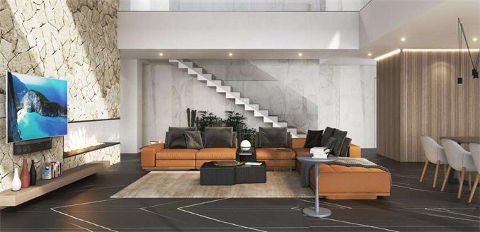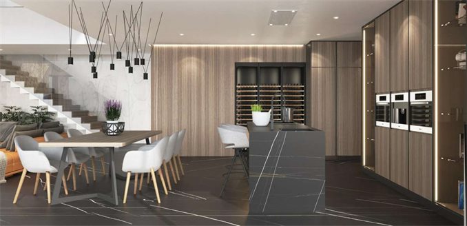 High-end Dica kitchen, Gaggenau appliances, Grohe taps, Cortizo Cor Vision Plus carpentry, anti-solar crystals, automatic blinds, large format porcelain floors 3,20m x 1.60m, My home, LED, Bticino electrical mechanisms.
