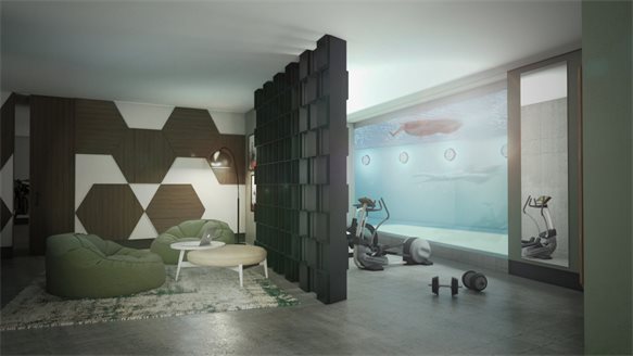 The gorgeous villa also holds a spacious kitchen with a pool and an underwater window to the gym, two terraces, one with a nightstand, wooden bridge on the upper floor.