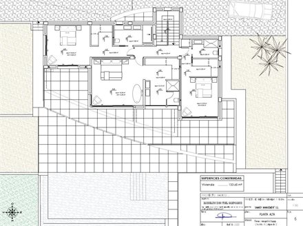This luxury villa is distributed over 3 floors: on the ground floor (147.30m2) there is a large bright living room next to the open kitchen with cooking island, a guest toilet and a bedroom with en-suite bathroom. On the outside of this floor we find the pool and the barbecue area. Then we go up to the upper floor (133.65m2) where we find 3 spacious rooms with their bathroom en suite. Finally the basement, where it leads to a double garage and laundry.