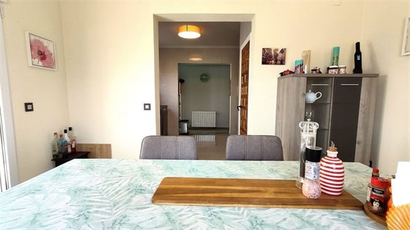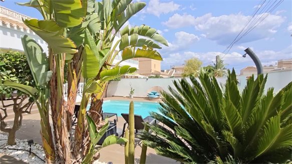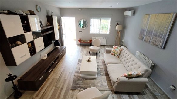 On the ground floor you have the bright and spacious living room, a modern bathroom, 2 double bedrooms with fitted wardrobes and large fully equipped separated kitchen with its wonderful dining area. The dining area has a door to the garage and outside area which is very useful and handy. The lovely sunny terrace just in front of the lovely pool gives you access to the wonderful garden, pool and BBQ area. The garden is beautifully designed and decorated with citrus trees and relax area as well private parking area and garage/ storage room.
