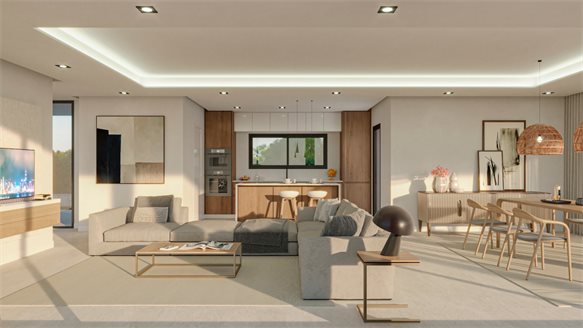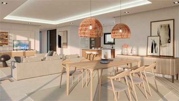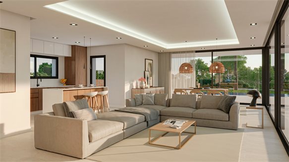From the open plan living room and kitchen, you can enjoy direct access to the stunning infinity pool, which seems to merge with the horizon. In addition, an underground garage and outdoor recreation areas complete the functionality of this exclusive residence.