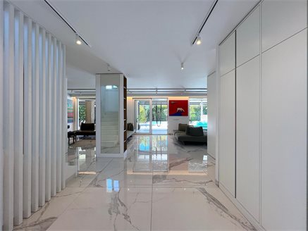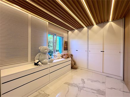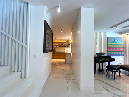 The total area of the house is 400 m2, which is distributed over several floors and spacious rooms. The lower floor has an endless living room with direct access to the terraces and pool, a semi-separate fully furnished kitchen with an island and access to the dining area and an additional kitchen on the terrace overlooking the garden and pool, also to the barbecue area.