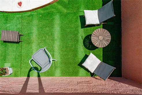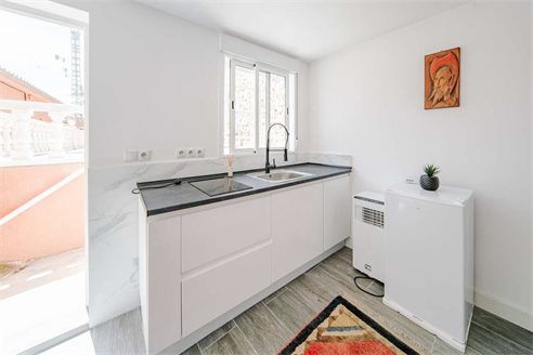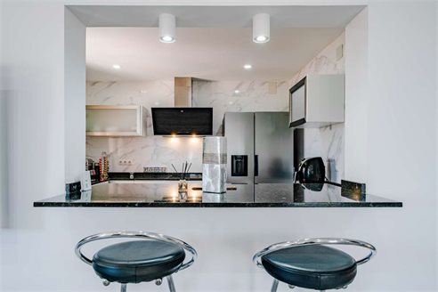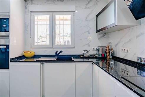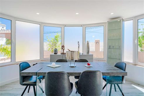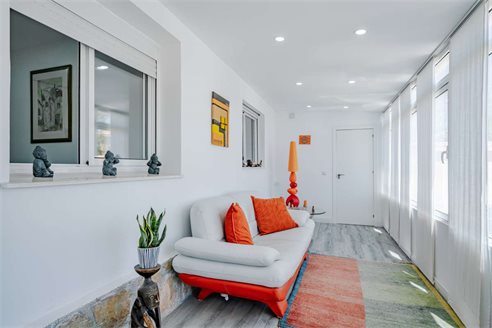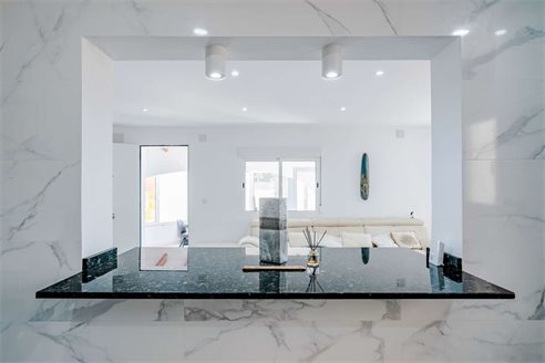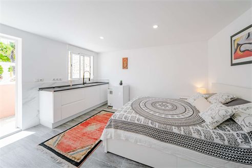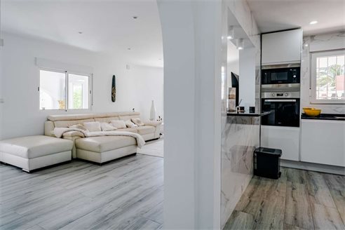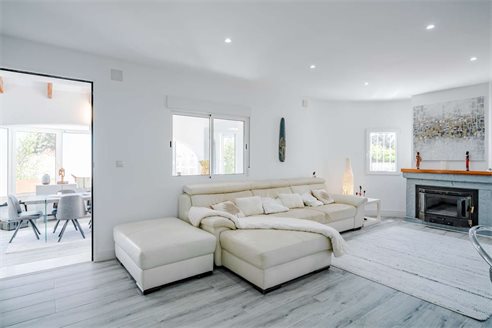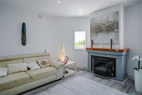 This villa was completely renovated in 2022. The exterior of the house has a traditional Mediterranean style and the interior is modern in light colors. The house consists of a glazed terrace where you can enjoy a meal or read a book, a living room with a wood-burning fireplace, a fully equipped open-plan kitchen with a breakfast bar, two bedrooms, one with an en-suite bathroom, and a bathroom.