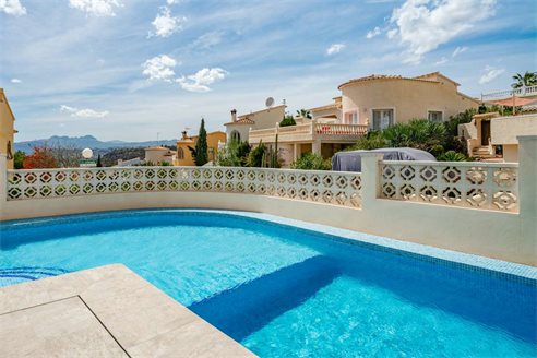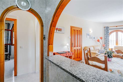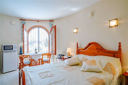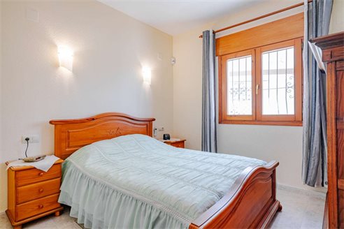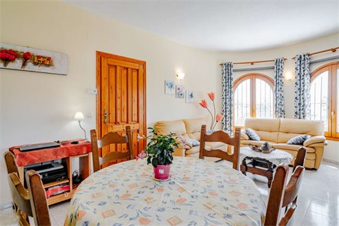 Detached villa with private pool, beautiful views of the mountains and located between Jávea and Moraira. The villa has a total constructed area of 205 M2 (105 M2 of housing, 66 M2 of terraces, 10 M2 of storage rooms and 24 M2 of parking) on a plot of 329M2. The villa consists of three bedrooms, two bathrooms, living room with fireplace, fully equipped kitchen, several storage rooms, several terraces and two parking spaces. The villa is built on two floors, on the main floor we have two bedrooms, a bathroom with shower, living room, kitchen, storage room and access to the covered and open terrace. The basement consists of a very spacious double bedroom and its own bathroom, as well as storage rooms and access to the private pool terrace. From the terrace on the main floor we also access the solarium via a spiral staircase. The property is sold fully furnished.