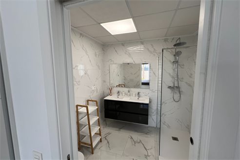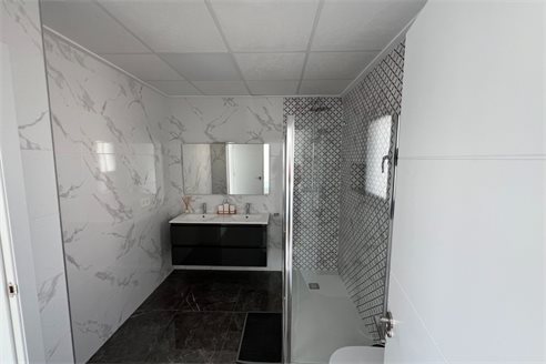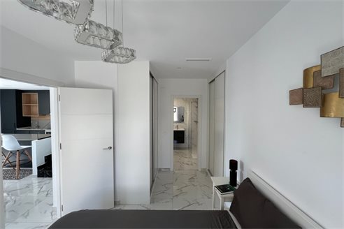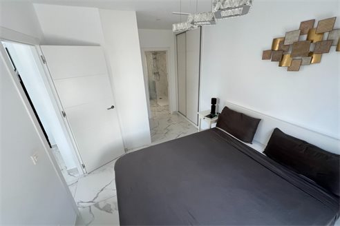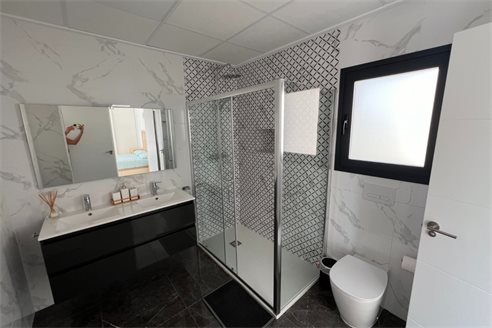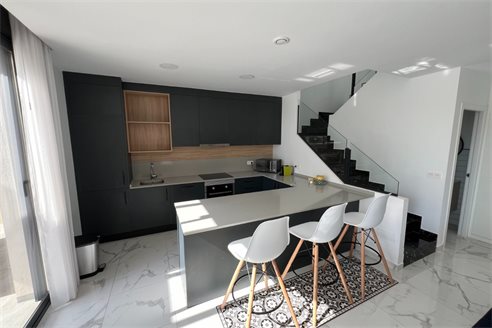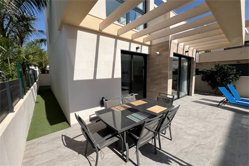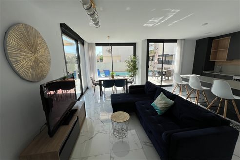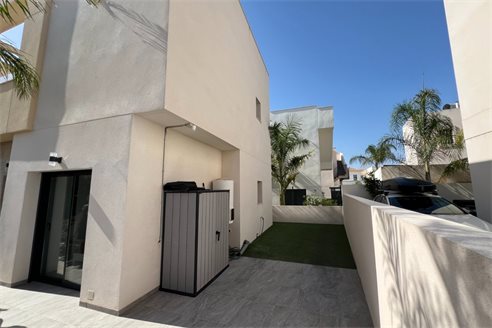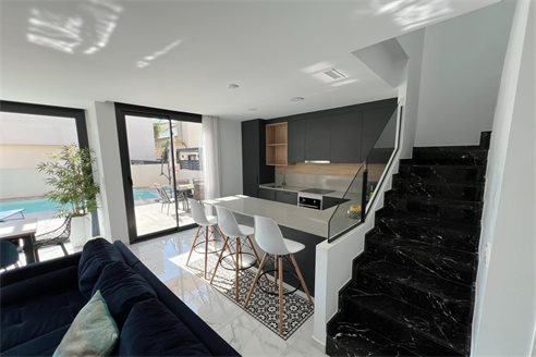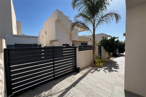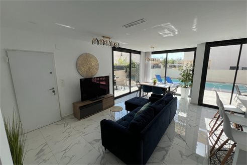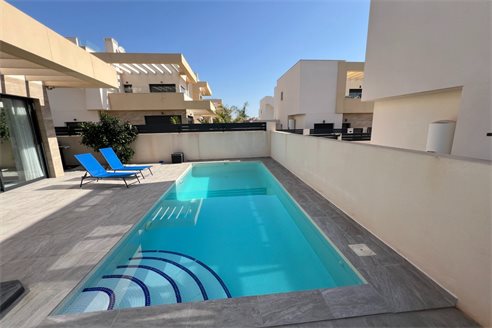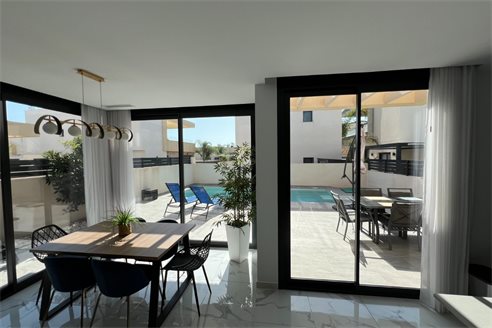This modern villa, constructed in 2021, epitomizes contemporary design and luxury living. Situated in La Herrada, Los Montesinos, the villa covers a build size of approximately 115m² on a south and east-facing plot of 225m², ensuring ample natural light throughout the day. The ground floor is a testament to open-plan living, featuring a spacious kitchen seamlessly integrated with a lounge and dining area. Three expansive picture windows flood the space with light and provide unobstructed views of the private pool and a large sun terrace, perfect for outdoor relaxation and entertainment. The villa boasts three generously sized bedrooms, each fitted with ample closet space. Two of these bedrooms include en-suite bathrooms, offering privacy and convenience. One bedroom stands out with its access to a large balcony, an ideal spot for morning coffee or evening relaxation. In addition to the terrace and balcony, the villa includes a large solarium, providing breath taking views of the surrounding area, including the stunning salt lakes. This property is an excellent choice for those seeking a modern, stylish home in a peaceful yet well-connected area.