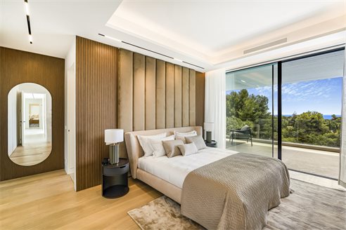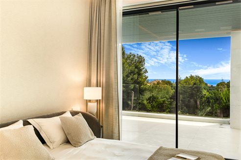 Main level On the main level the spacious living room is separated into sitting and dining area. There is also an open plan, fully equipped stylish kitchen, a bedroom with en-suite bathroom and a guest toilet. The outdoor area has the swimming pool, a barbecue area and kitchen. The upper-level features master bedroom with en-suite bathroom and direct access to a terrace with sea views. There are also two bedrooms sharing a bathroom, both open onto the terrace as well.