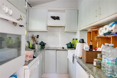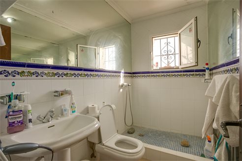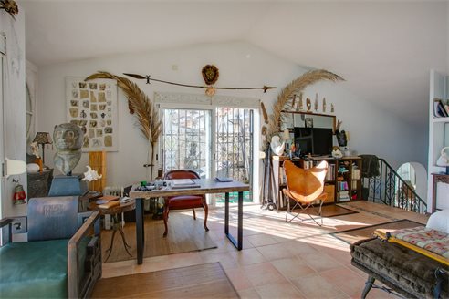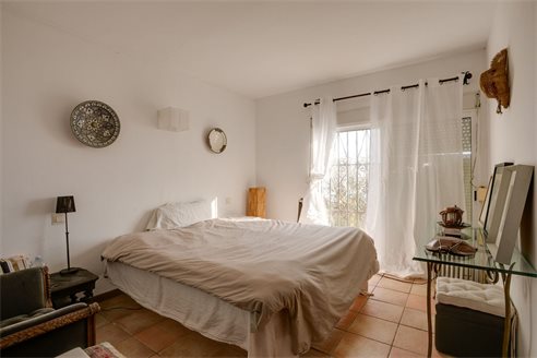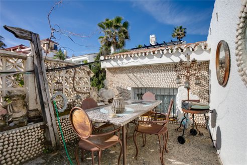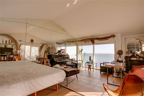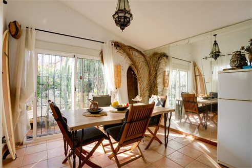 The house is situated in the middle of the plot and is fully walled with a small gate taking you out onto the beach. Inside you have a guest toilet, dining room next to the kitchen which could be opened up to make the kitchen much larger. Up a few stairs you have the living room which high vaulted ceiling that offers stunning views for each window.